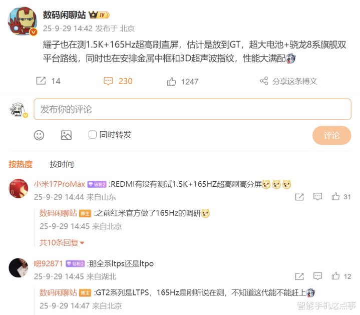 原因是近期有博主爆料,荣耀正在测试一款配备1.5K分辨率、165Hz高刷新率直面屏的新机型,并且这款屏幕预计将用于荣耀GT2系列新机。